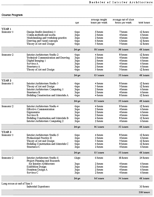 The interior architecture studio subjects are supported by specialist subjects in structures and services, building construction and materials, communication methods and media, ergonomics, exhibition design, furniture design, computer-aided design, professional practice, project research and planning and marketing. The course is further supported by subjects in the theory, history and contemporary discourse in art, design and architecture, as well as by introductory subjects in drawing and visual concepts and digital imaging.